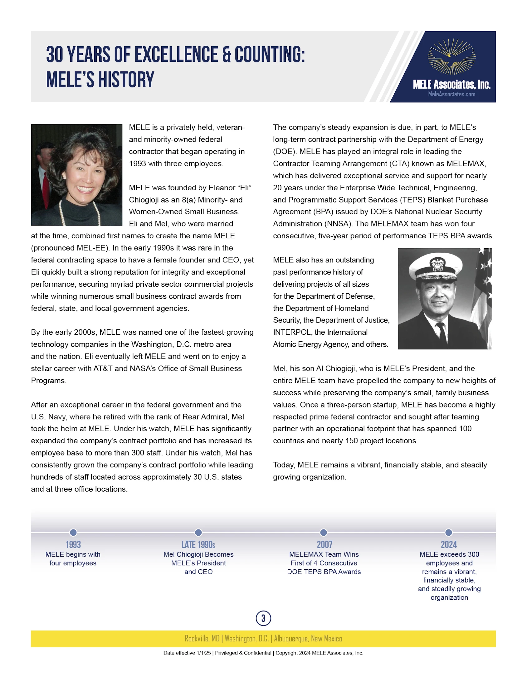 MELE is a privately held, veteran-owned federal contractor that began operating in 1993 with three employees. MELE was founded by Eleanor “Eli” Chiogioji. By the early 2000s, MELE was named one of the fastest-growing technology companies in the Washington, D.C. metro area and the nation. Eli eventually left MELE, with Mel taking the helm after retiring from the U.S. Navy as a Rear Admiral.
